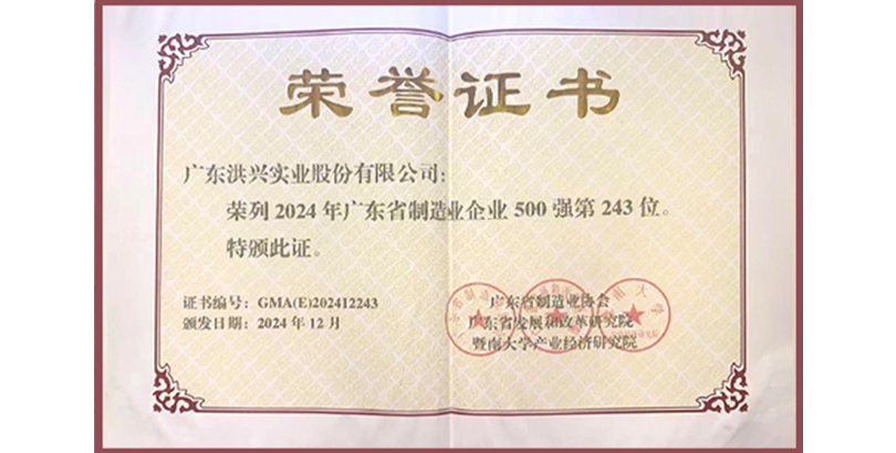 洪興股份榮登廣(guang)東省製(zhi)造(zao)業500強;